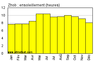 Moyenne mensuelle du nombre d'heures de soleil par jour.